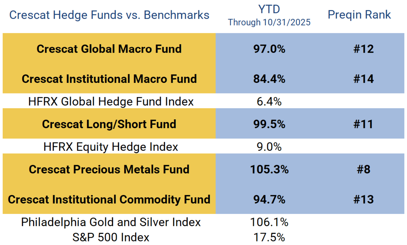 Crescat is having an outstanding year. All 5 of our funds rank in the top 15 among 1,397 hedge funds in the Preqin database for 2025 year-to-date performance through November 21, 2025. Click Here.