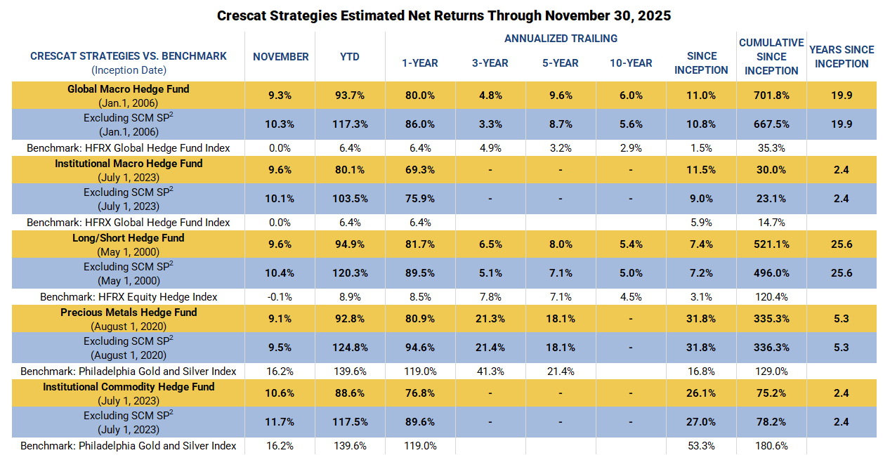 As 2025 draws to a close, Crescat Capital is celebrating a standout year of performance. All five Crescat hedge funds have delivered strong results in November and year-to-date.