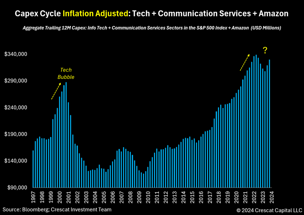 We believe unsustainable capital expenditure trends in the broad technology and communications sectors are an economic warning signal. The chart below shows how the capex cycle drove the boom and bust of the 2000 tech and telecommunications bubble. We inflation-adjusted the data in this chart using the Consumer Price Index to display the entire time series in today’s dollars. It reveals a comparably larger extreme capex binge in real terms in recent years compared to the 2000 Internet spending peak in those same two sectors. We have added Amazon to this group because the company is the largest tech hyperscaler today as we explain further below. It is otherwise overlooked because it is categorized in the consumer discretionary sector due to its online retail business. We are excited about the technological advancements in AI that all this spending has produced, but our research shows that capital spending trends are cyclical. It’s a basic law of economics that companies cannot spend endlessly without a clear path to getting a positive net-present-value return on that investment.