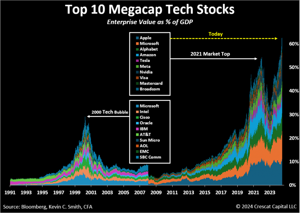 Cisco Systems was the most valuable company in the world at the peak of the dot-com bubble in March 2000. Its stock price had reached a high of $80.06 per share giving the company an enterprise value (EV) of $548 billion or 5.5% of US GDP and 37 times sales. Investor exuberance over tech stocks was high. The future economic promise of the Internet for the world economy was strong, but the forward earnings growth rates implicit in tech stock valuations were not achievable. Stocks had overshot. Tech earnings were getting ready to inflect sharply downward in the course of the normal business cycle. Cisco’s stock price would fall 89% over the next two-and-a-half years. The stock price has yet to return to its prior high in the 24 years since. Advancements in AI technologies today portend enormous productivity benefits for the long-term growth of the economy, just like the Internet did in 2000. But valuations among the leading technology companies are even more stretched today than they were then implying future earnings growth rates that once again should prove impossible to achieve. For instance, Nvidia recently earned the most valuable company in the world status with an EV of $3.3 trillion, a record 11.7% of total US GDP at its recent peak on June 18, more than twice as high as Cisco’s achievement in 2000. It also has an even richer multiple of 41 times revenues. We think it has impossible future growth expectations to live up to.