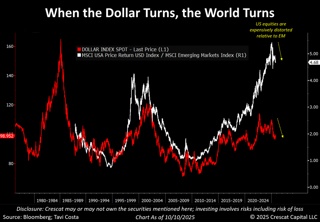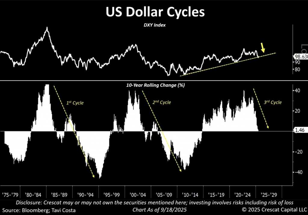 If sustained, this could usher in one of the most consequential reversals in the dollar cycle in decades — potentially favoring emerging markets, real assets, and non-US exposure as global capital begins to rotate away from dollar-denominated assets.