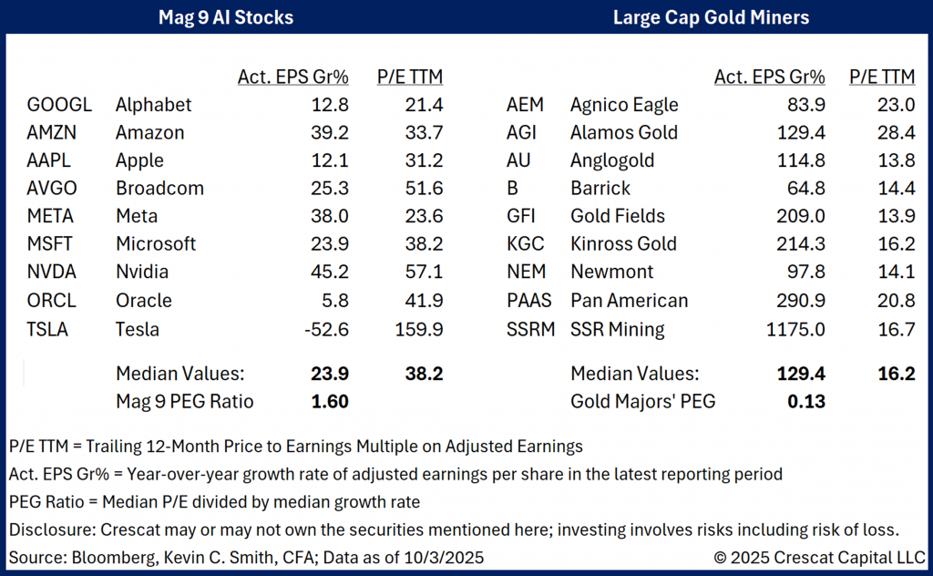The logic that valuations aren’t dangerous until they match prior records shows how far the market appears to have drifted from any sense of balance. Deploying capital into the S&P 500 or Nasdaq 100 index Funds, dominated by the Magnificent 9 tech stocks, at these levels assumes that gravity no longer applies. We prefer to stay anchored in history. Rather than chase this illusion, we prefer to play what we believe is an impending Great Rotation out of mega-cap tech and into countercyclical value and growth stocks, such as the gold mining stocks, which have both lower valuations and higher current growth rates than big tech stocks, as we show in the chart below.