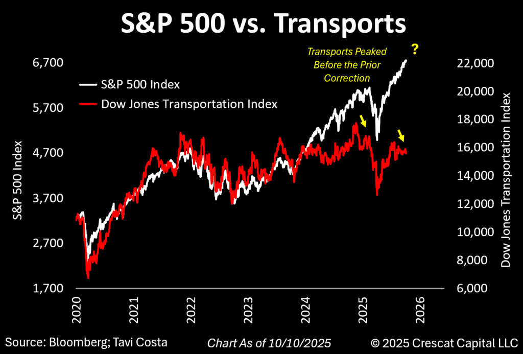 The Dow Jones Transportation Index, often a reliable leading signal for broader equity trends, reinforces this view. As a real-economy barometer of logistics and industrial activity, it typically turns before the S&P 500 does. Today, however, the transports have failed to confirm the S&P’s push to new highs — a divergence that echoes the pattern seen just before the last major market correction.