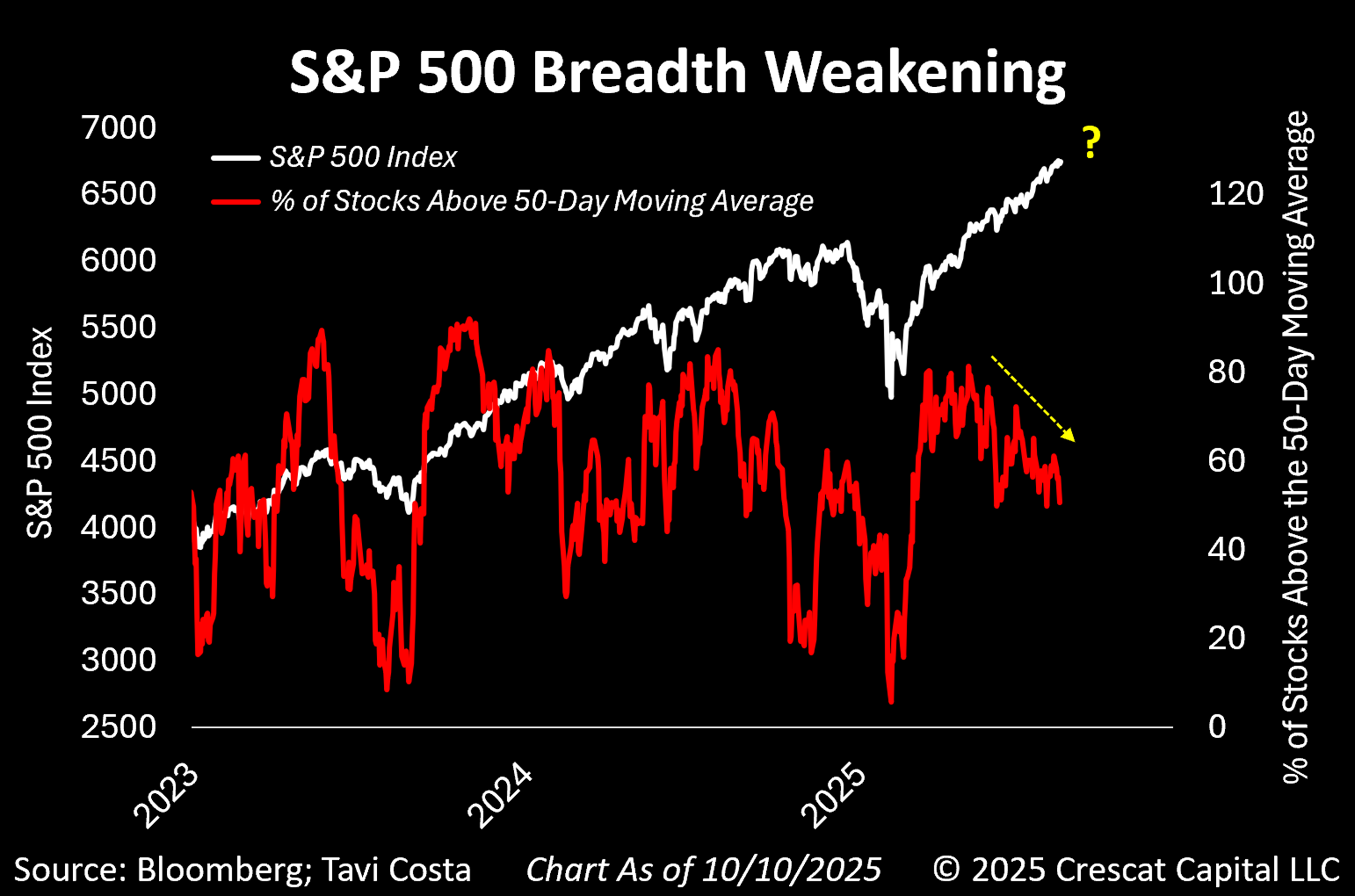 When forming a near-term tactical view, it helps to look beyond headline indices and focus on market breadth. Beneath the surface, weakness is spreading. Only about half of the S&P 500’s constituents now trade above their 50-day moving average — a sharp deterioration that reveals how narrow the rally has become. A handful of mega-caps are holding the index aloft while the broader market quietly softens. Historically, that kind of divergence rarely ends well.