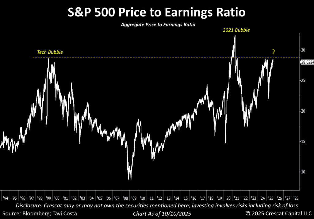 No matter how one looks at it, equity valuations have drifted back into rarefied territory. Robert Shiller’s cyclically adjusted P/E now stands above its 2021 peak, not far from where it sat at the height of the dot-com bubble. Together, these indicators paint a picture of a market increasingly detached from fundamentals and driven by momentum and belief. It feels like one of those moments when fear is scarce and greed has taken over. From both a tactical and historical perspective, this setup looks like one of the most precarious in recent memory.
