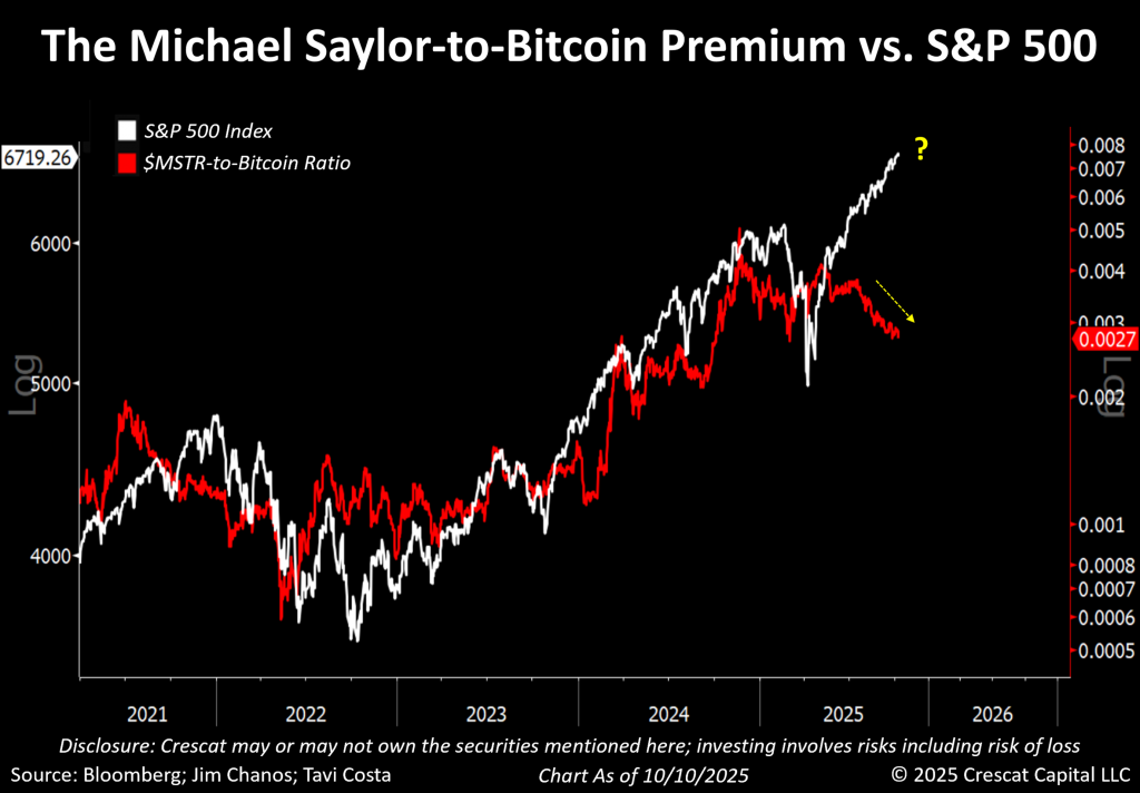 Chanos pointed out that this “Saylor premium,” or the outperformance of Strategy’s shares versus Bitcoin itself, has shown a remarkably high correlation with the S&P 500 — a reflection of how tightly speculative behavior has become intertwined across markets. That premium now appears to be eroding. To us, that divergence signals something important: the highest-beta corners of the market are beginning to quietly de-risk ahead of a broader equity unwind.