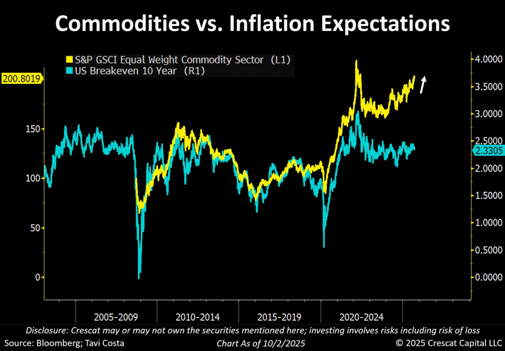 The divergence between commodity prices and market-based inflation expectations has reached extreme levels. In our opinion, commodities are the real anchor of inflation — the cost base of everything — and right now they’re sending a much louder signal than the bond market. The market’s complacency toward inflation risk is astonishing.