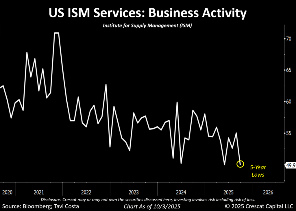 The latest ISM Services report tells the story clearly. The “prices paid” component is approaching 70, while employment has fallen well below 50. That combination — surging input costs with weakening labor demand — highlights the Fed’s policy trap in its purest form.