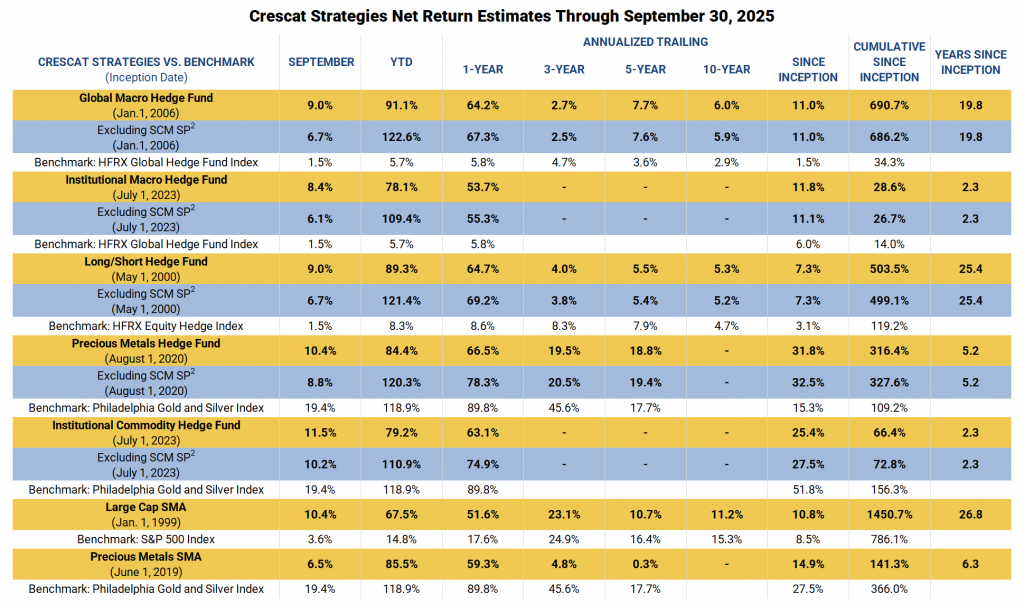 Most recent month’s performance is based on preliminary estimates. Performance data represents past performance, and past performance does not guarantee future results. Performance data is subject to revision following each monthly reconciliation and/or annual audit. Performance figures presented Excluding SCM SP represent the fund’s net returns calculated without the impact of the San Cristobal Mining, Inc. side pocket that was designated on July 1st, 2024. The side pocket includes a private equity asset that is not available to new investors in the funds on or after July 1, 2024. Excluding these assets provides a clearer view of the performance to investors coming into the funds after that date. New investors cannot participate in the SCM Side Pocket and will not share in its potential gains or losses. Investors should consider both the overall performance and the performance excluding the side pocket when evaluating the fund’s returns. Net returns reflect the performance of an investor who invested from inception and is eligible to participate in new issues and side pocket investments. Net returns reflect the reinvestment of dividends and earnings and the deduction of all expenses and fees (including the highest management fee and incentive allocation charged, where applicable). An actual client’s results may vary due to the timing of capital transactions, high watermarks, and performance. Data shown is generated by Preqin, a leading provider of data and intelligence for the alternative assets industry. Fund managers, including Crescat, report their performance information to Preqin. Crescat pays an annual fee to Preqin to have access to the database, which gives us the ability to generate this report. The rankings are versus all 483 hedge funds in the Preqin database and YTD performance updated through September 2025 as of 10/10/2025. No award or ranking should be construed as a guarantee that you will experience a certain level of results, nor should it be construed as a current or past endorsement of Crescat. Additional performance information can be found on Crescat’s website here: https://www.crescat.net/performance/