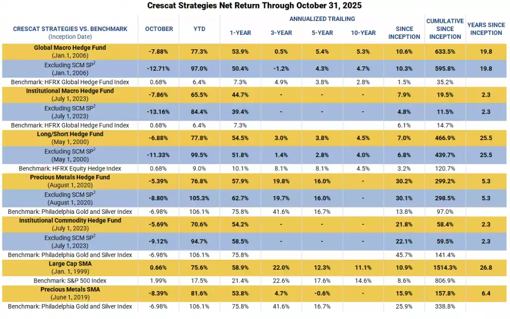 While Crescat’s hedge funds were down in October, primarily due to the pullback in precious metals mining stocks, it is important to note that Crescat still had 5 of the top 15 performing hedge funds through October 31st year to date, according to the Preqin database.