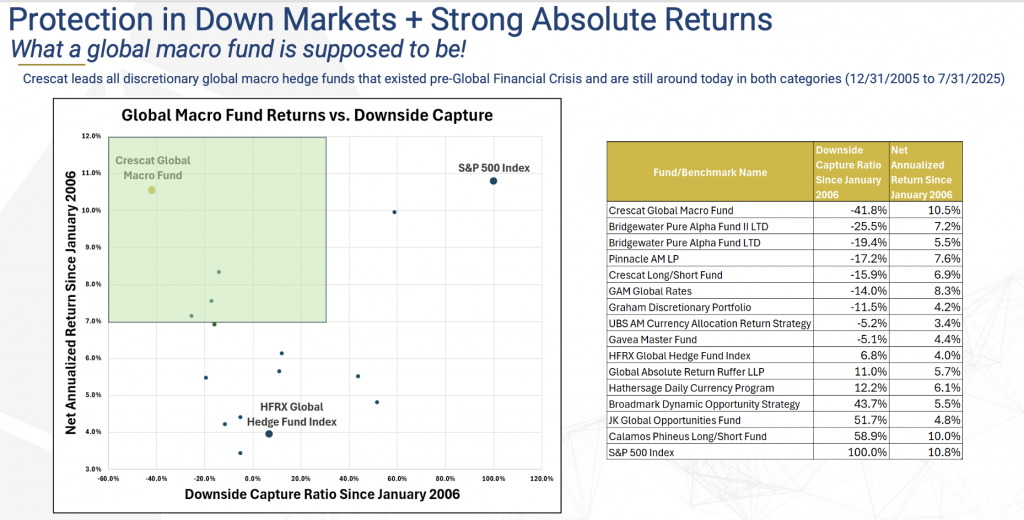 Data shown that is generated by Preqin, a leading provider of data and intelligence for the alternative assets industry. Fund managers, including Crescat, report their performance information to Preqin. Crescat pays an annual fee to Preqin to have access to the database, which gives us the ability to generate this report. The rankings are versus all 2,572 hedge funds in the Preqin database and YTD performance updated through July 2025 as of 9/4/2025. No award or ranking should be construed as a guarantee that you will experience a certain level of results, nor should it be construed as a current or past endorsement of Crescat. Additional performance information can be found on Crescat’s website here: https://www.crescat.net/performance/