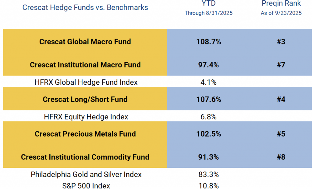 Crescat’s strategies continue to receive recognition for their strong performance. As of August 31, five of Crescat’s funds ranked among the top eight hedge funds globally year-to-date according to Preqin, a leading independent provider of alternative asset data and analytics. Out of 1,375 hedge funds in the Preqin database, Crescat’s flagship Global Macro Fund achieved the #3 ranking.