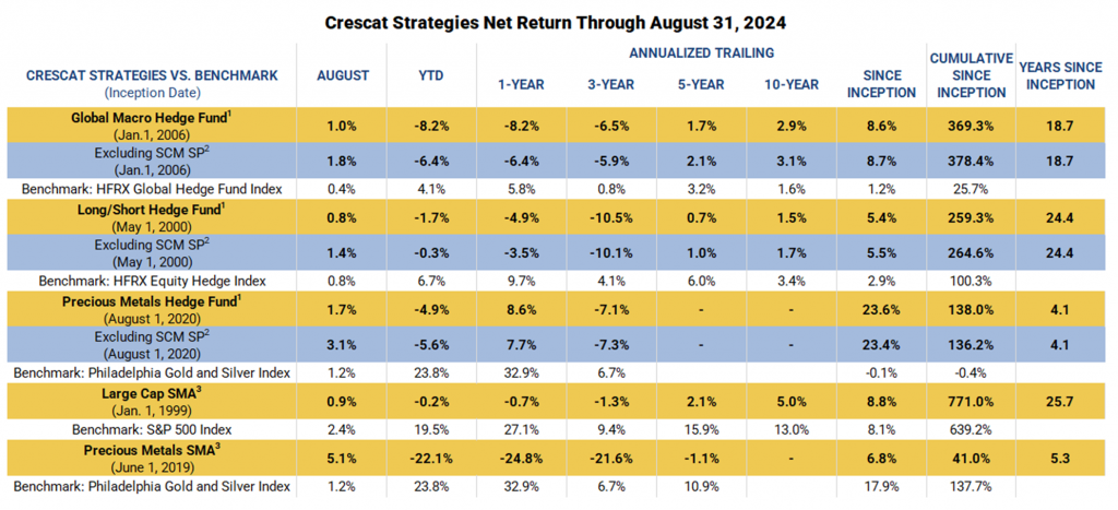 Separately Managed Account (SMA) disclosures: The Crescat Large Cap Composite and Crescat Precious Metals Composite include all accounts that are managed according to those respective strategies over which the manager has full discretion. SMA composite performance results are time-weighted net of all investment management fees and trading costs including commissions and non-recoverable withholding taxes. Investment management fees are described in CPM’s Form ADV 2A. The manager for the Crescat Large Cap strategy invests predominantly in equities of the top 1,000 U.S. listed stocks weighted by market capitalization. The manager for the Crescat Precious Metals strategy invests predominantly in a global all-cap universe of precious metals mining stocks.